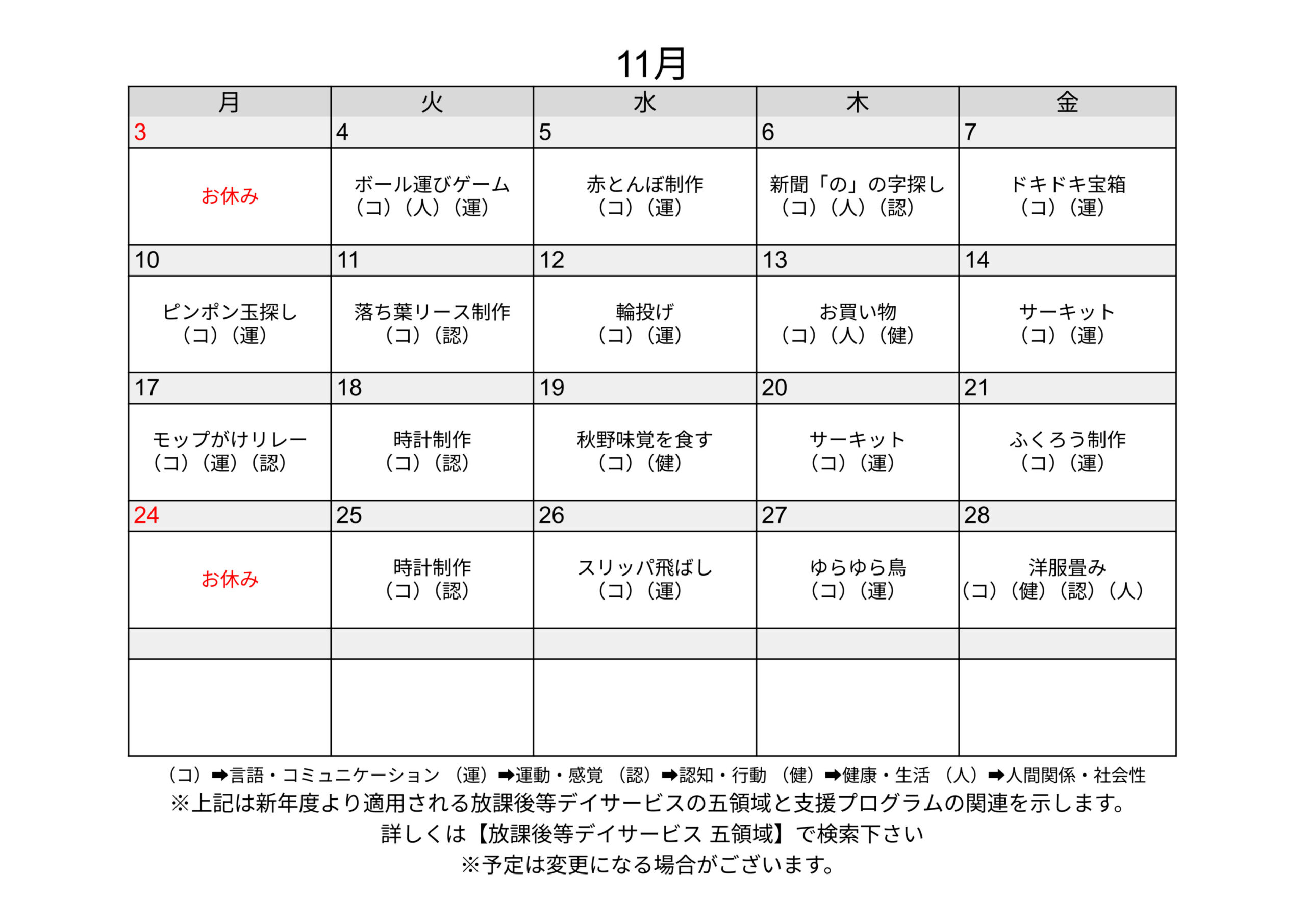詳しくは、「放課後等デイサービス 5領域」で検索ください。